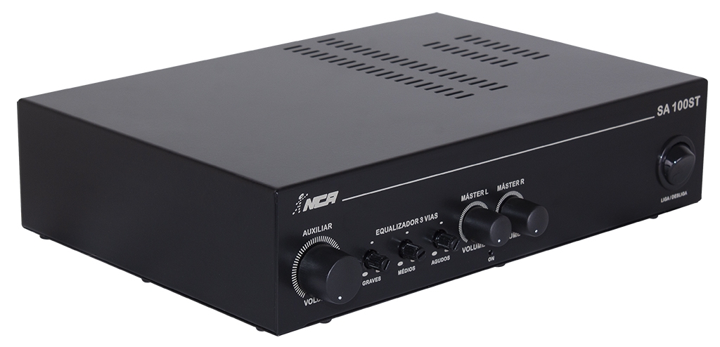 O SA 100ST é um amplificador compacto de estéreo de 2 canais de 30W RMS por canal em 4Ω, que permite a ligação direta de 2 caixas de 8Ω ou de até 8 caixas em série/paralelo por canal. Projetado com amplificação Classe AB, entrega som limpo e consistente para sonorização de ambientes como academias, bares, empresas, áreas de lazer, clínicas, espaços gourmet e outros. Possui equalizador de 3 vias e oferece entrada de microfone P10 com volume independente e função Mic Priority, além de entrada auxiliar RCA (L/R) com volume independente.